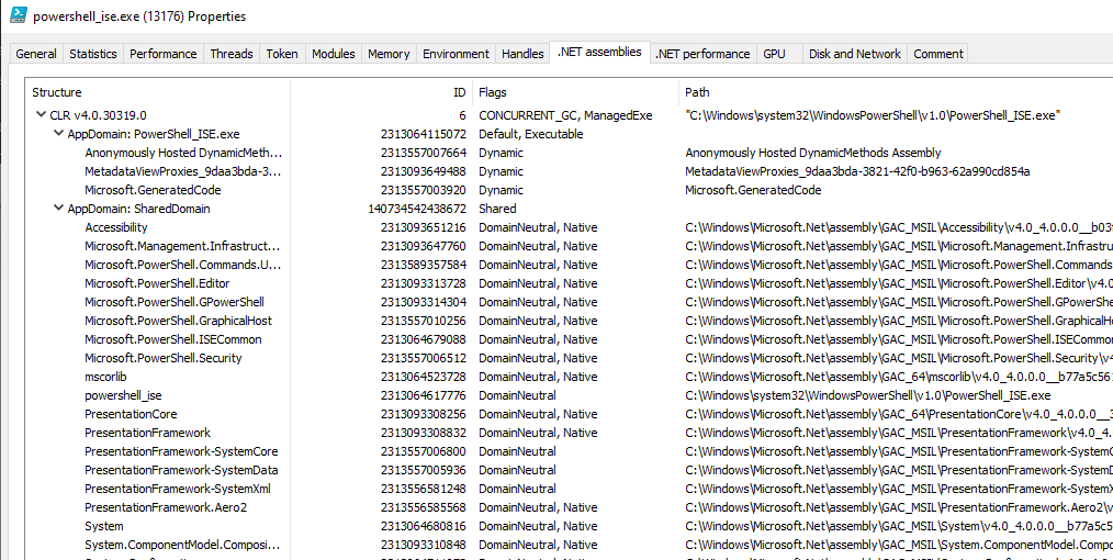 The Common Language Runtime is hosted within a native process and is where .Net assemblies are loaded and run. Honestly, I’m not going to go that deeply in this post on what each of these concepts are because it would be very long and frankly I would probably get it wrong 😊 . I will provide MSDN links at each applicable stage and code so you can explore for yourself. If you open up PowerShell and then use a tool like Process Hacker you can see the loaded CLR, the app domains, and assemblies that are loaded within.